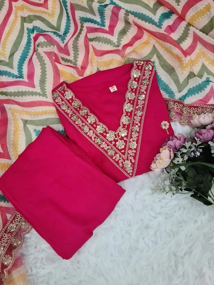 This stunning kurti set features a rich red viscose rayon fabric with exquisite embroidery, showcasing a blend of elegance and craftsmanship.
