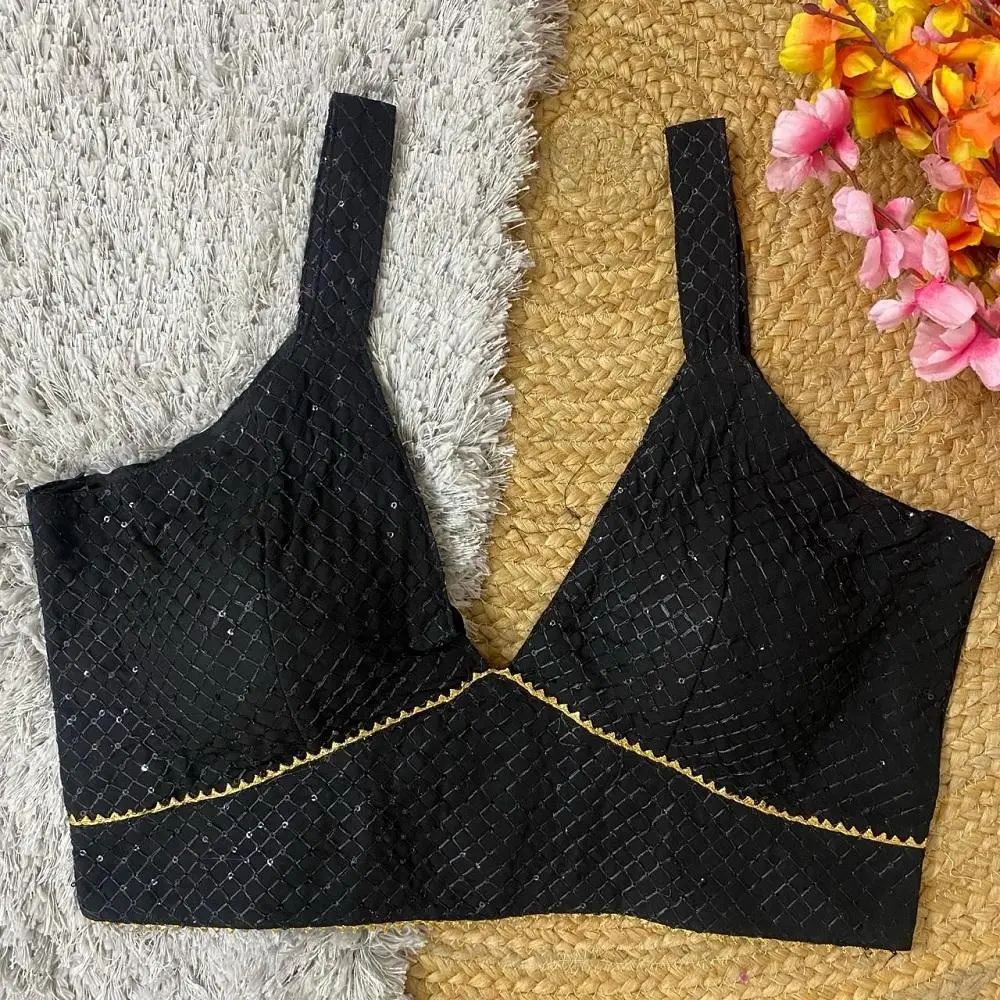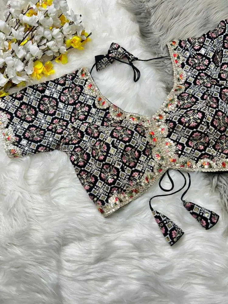 This Stunning Georgette Blouse is beautifully embellished with jari, sequence work, and gota pati lace, adding a touch of luxury and sparkle.