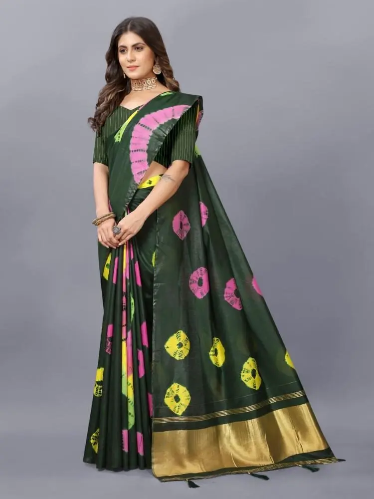 The Shibori Saree features a captivating Bandhani Print, blending two traditional dyeing techniques to create a unique and vibrant design.