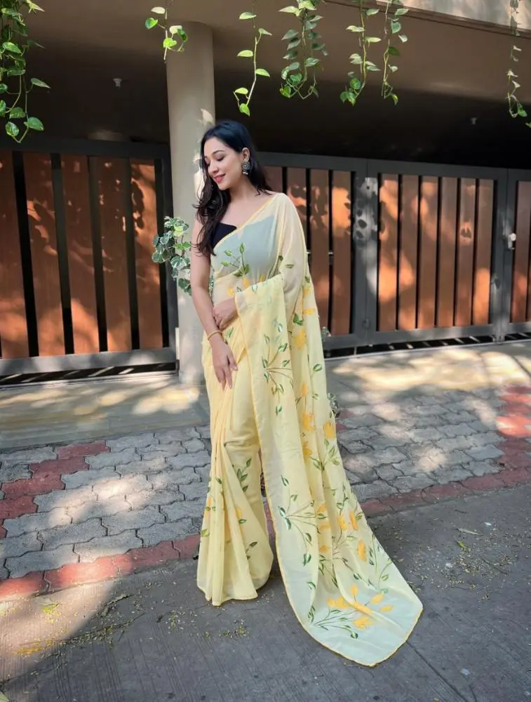 Introducing the Yellow Georgette Brush Printed Foil Lace Border Saree - a stunning blend of elegance and contemporary fashion. The vibrant brush print and exquisite foil lace border make this saree a radiant and eye-catching choice. Crafted from high-quality georgette fabric, it offers a beautiful drape and a luxurious feel. Perfect for any occasion, this saree will add a burst of sunshine to your wardrobe with its cheerful and stylish design.