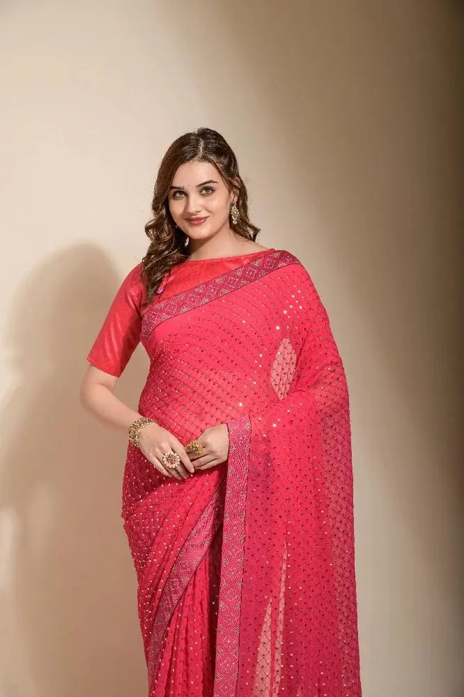 Intricate sequence embroidery dances across the flowing georgette, creating a scene of shimmering elegance.