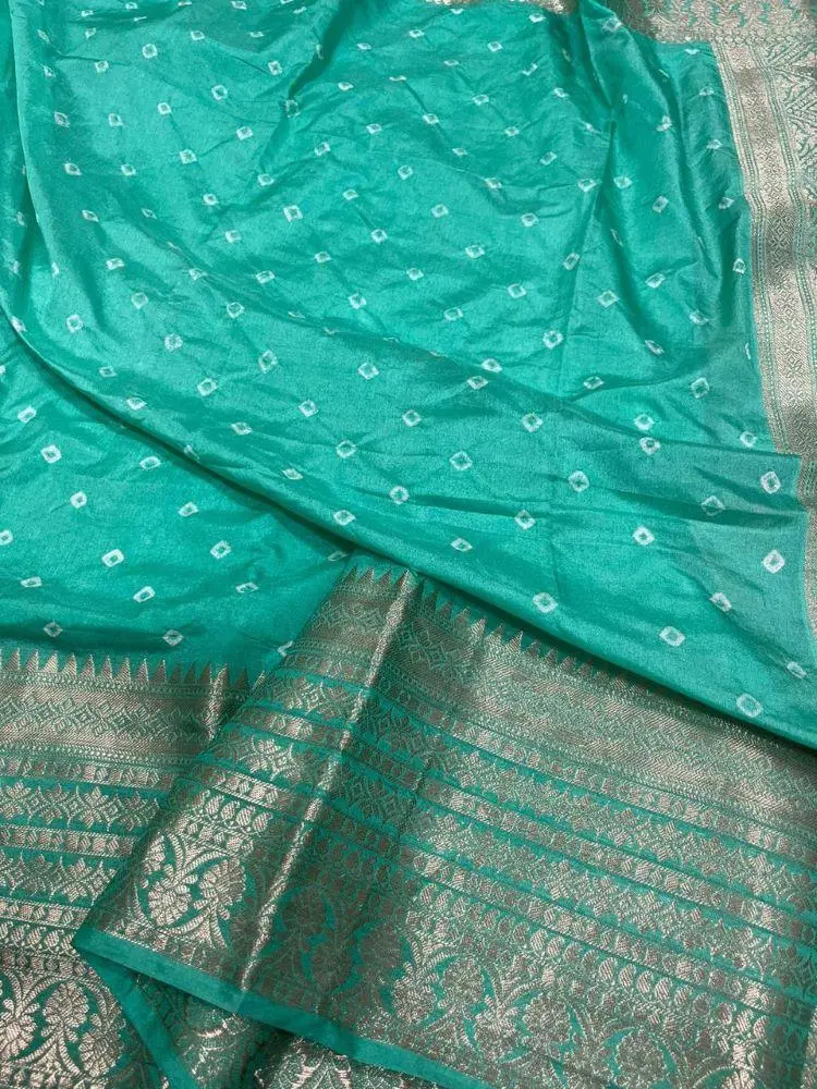 Immerse yourself in the opulent fusion of Banarasi heritage and Bandhani artistry with our exquisite Munga Bandhani Sarees.