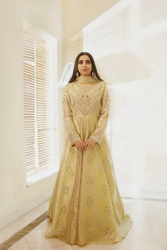 This Embroidered Net Gown showcases exquisite craftsmanship with its intricate threadwork and delicate patterns, creating a timeless beauty.