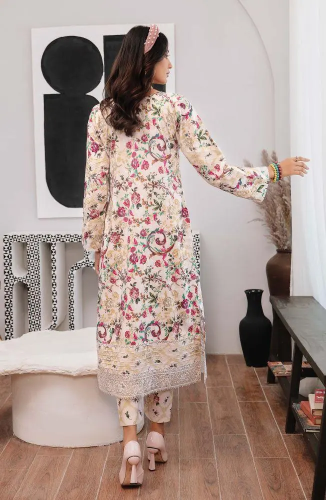 Complementing the top are trousers made from 2.5 meters of matching printed Khaddar, ensuring a cohesive and stylish look.