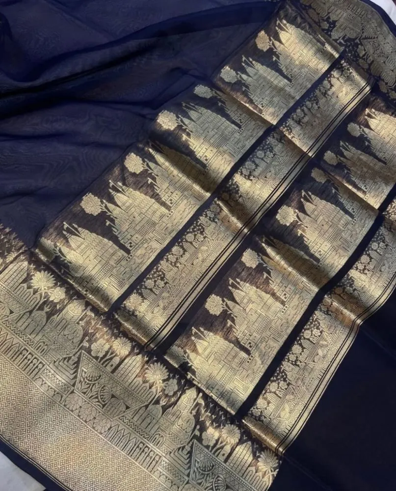 This exquisite Banarasi semi kora organza skut features a beautiful temple weaving design complemented by a soft fancy border.