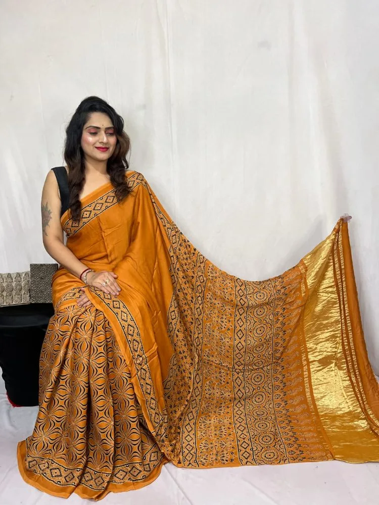 The ultra-soft fabric, complemented by a Kaddi Zari border and pallu, offers elegance and comfort, making it a perfect choice for any occasion.