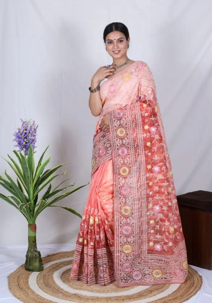 Chic Pink Organza Saree With Handcrafted Cut Work And Digital Print Code : YN-OR1006-PI