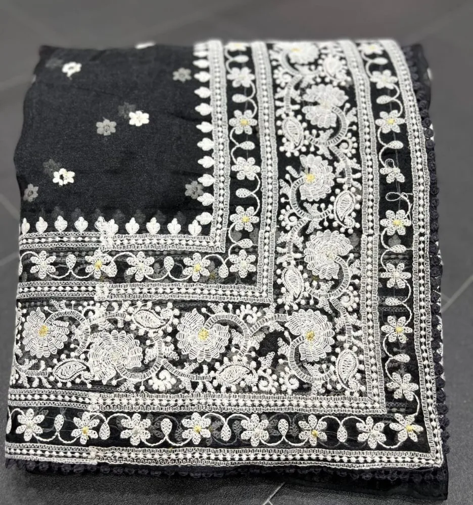 This stunning designer party wear saree is crafted from lightweight organza silk, featuring elegant thread work and fancy lace detailing across its 5.5-meter length.