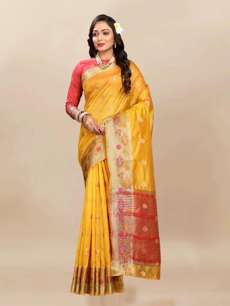 Experience elegance in our soft organza silk saree, adorned with intricate Meenakari weaving and a shimmering zari pallu. Perfect for both grand affairs and intimate gatherings, it exudes timeless charm and sophistication.