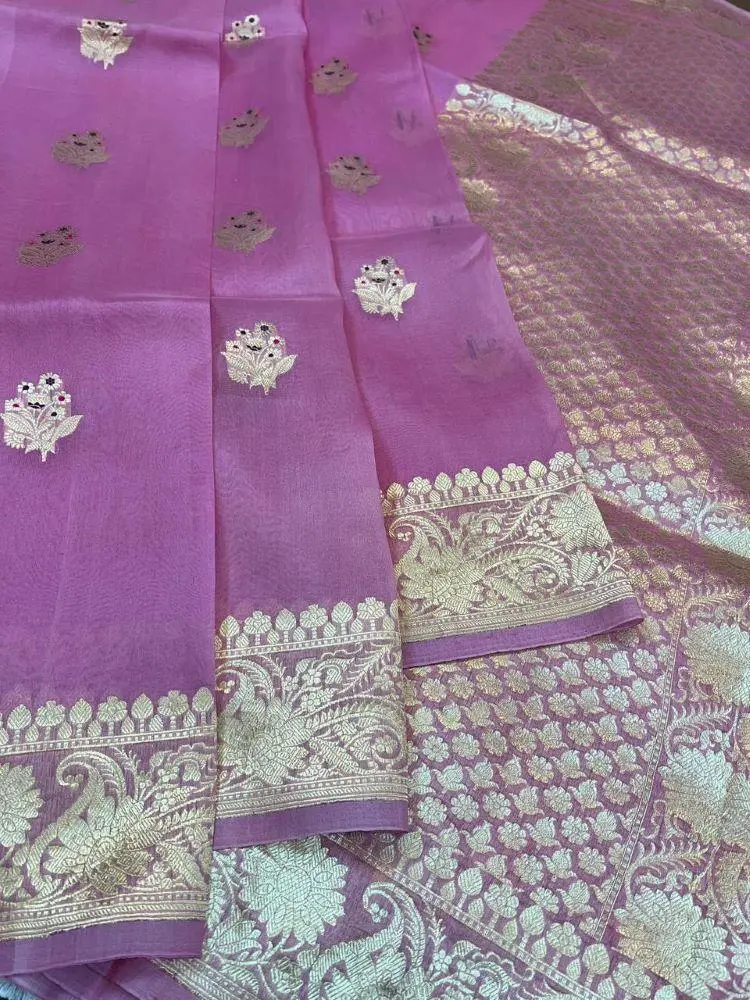 This stunning pure Kora silk saree blends luxury and artistry in a breathtaking lavender hue.