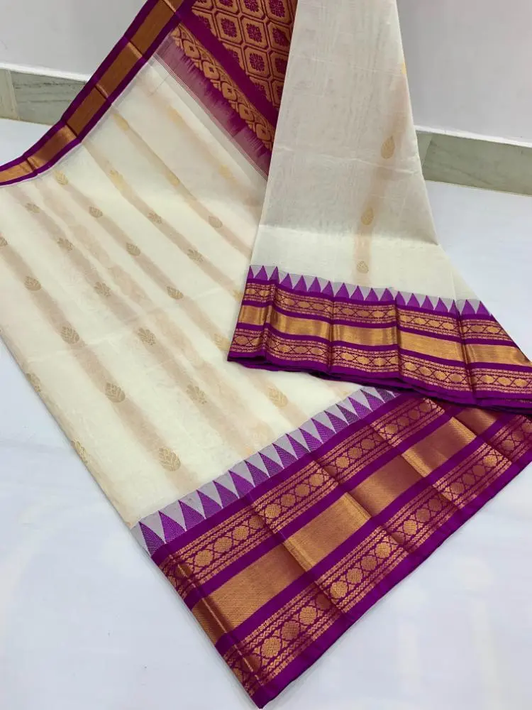 Gadwal Cotton With Temple Designs In White And Purple Code : MMSSRKUP1014