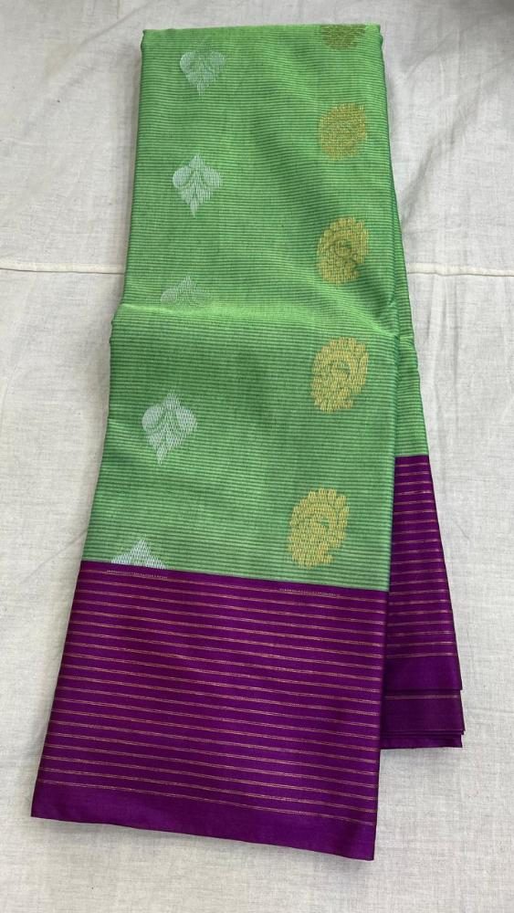 Its rich weaving pallu adds a luxurious touch, while the contrast blouse enhances the saree’s elegance.