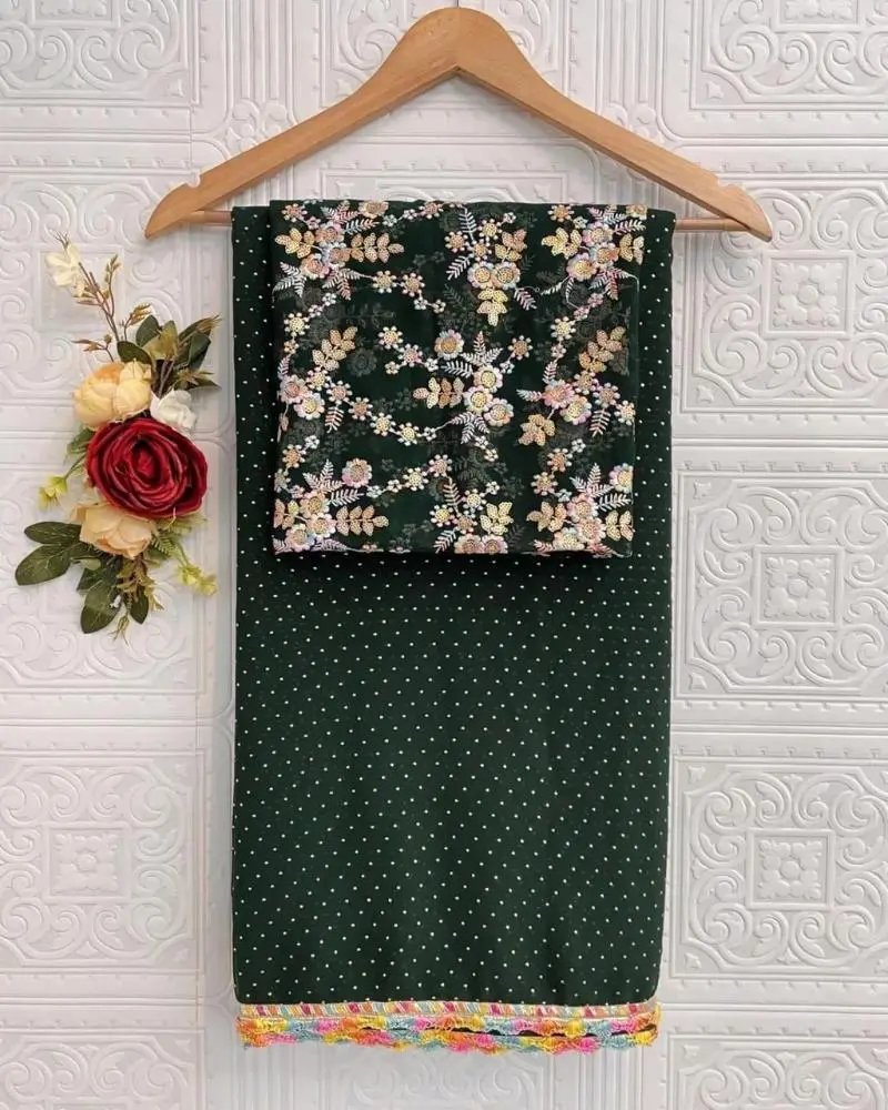 Georgette Saree With Rainbow Lace And Multi Embroidered Blouse In Green Code : YNSGGJHT16GR