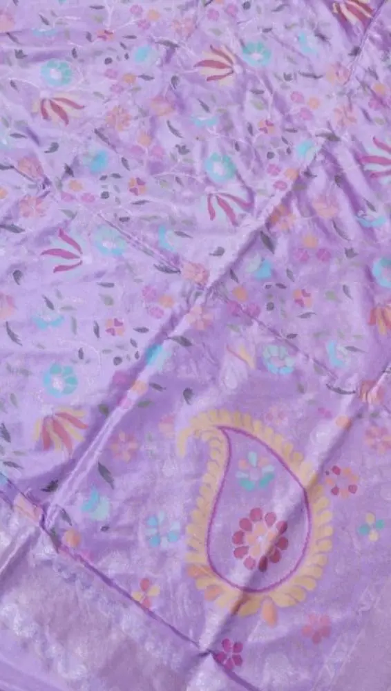 A breathtaking Banarasi Jamdani saree handwoven with "Nine Different Colours of Resham Threads" in beautiful Meenakari blossoms. A timeless and poetic Banarasi masterpiece on light and airy pure cotton.