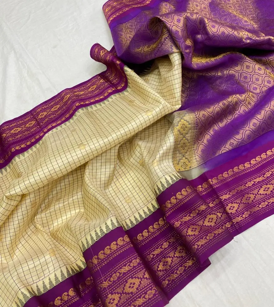Elevate your ethnic wardrobe with this exquisite semi Gadwal saree, crafted with lustrous fabric and intricate zari weaving.