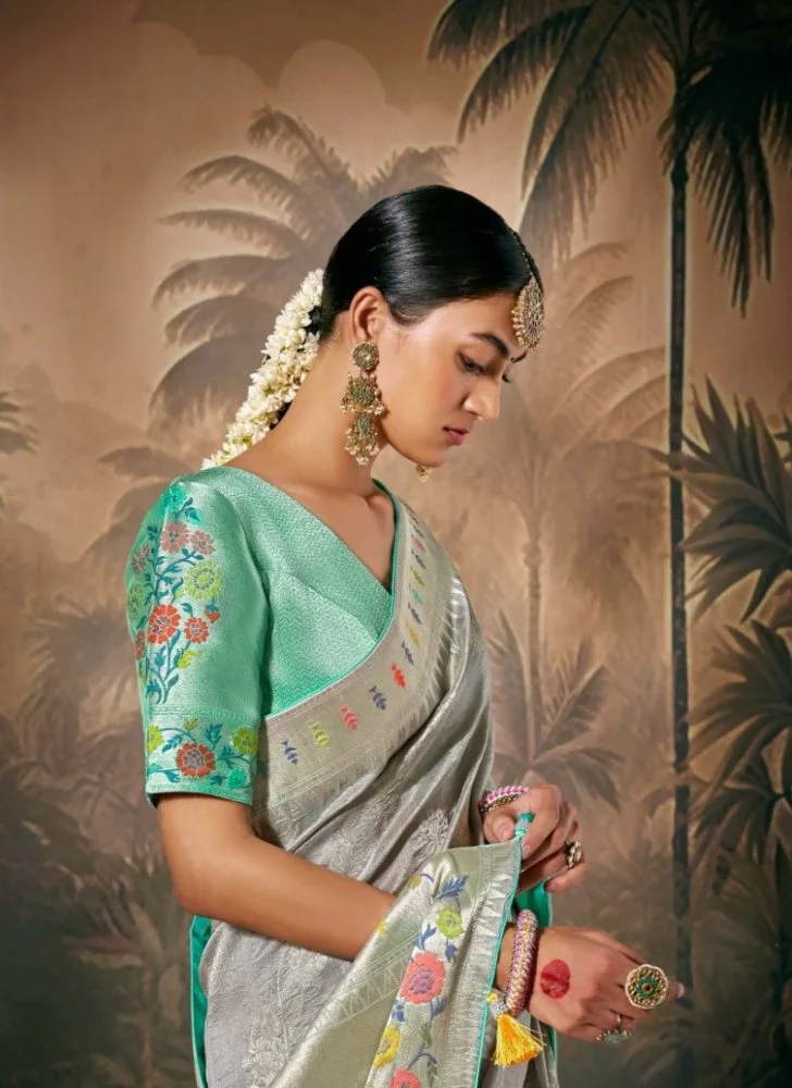 Experience elegance with Kimora's Sindhuri Rasm collection, featuring a beautiful Paithani Banarasi saree crafted from luxurious Munga silk.