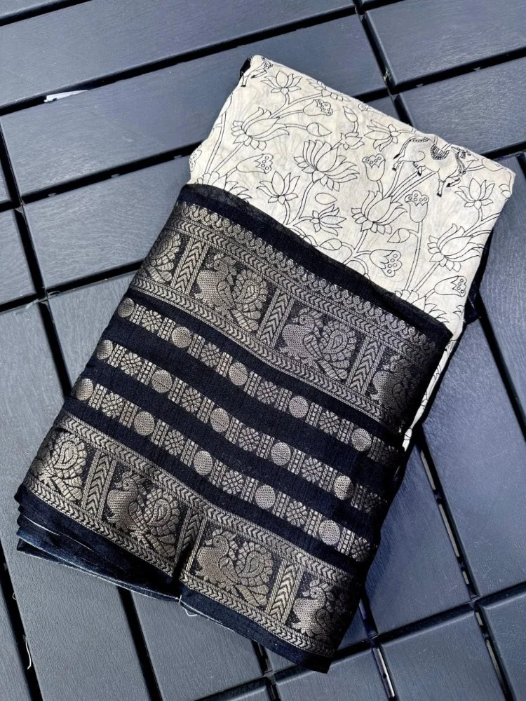 The saree measures 6.30 meters and comes with a running blouse, making it a complete and versatile outfit.