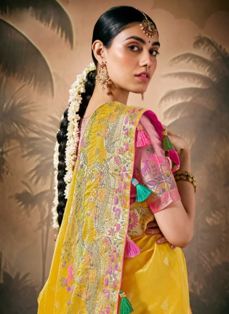 Luxurious Kimora Banarasi Saree With Tassels And Rich Pallu In Yellow Code : TMRWSMSK101YL
