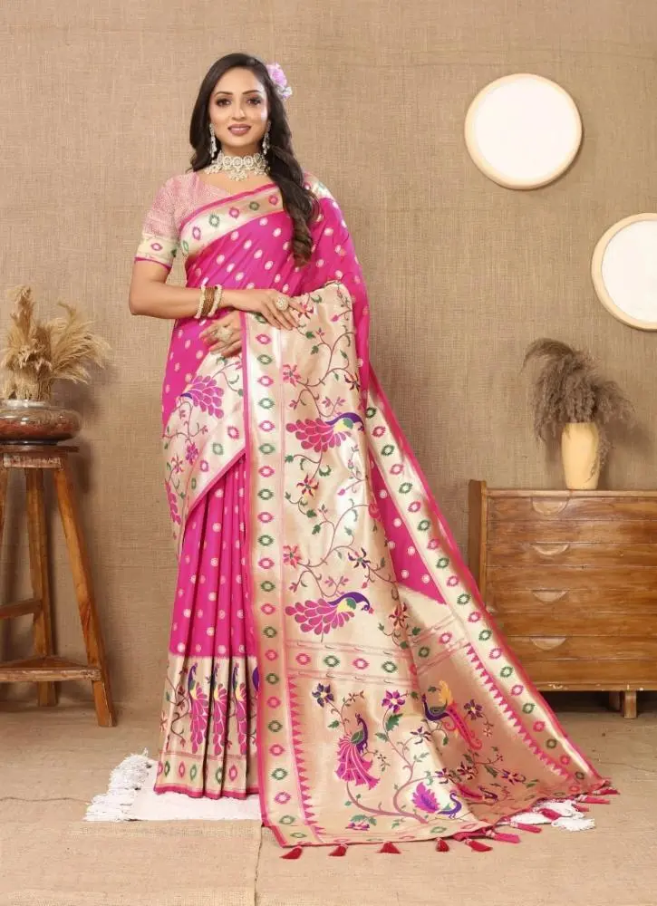 Experience elegance with our Soft Paithani Silk Saree, adorned with intricate Meenakari designs and a shimmering Zari border.