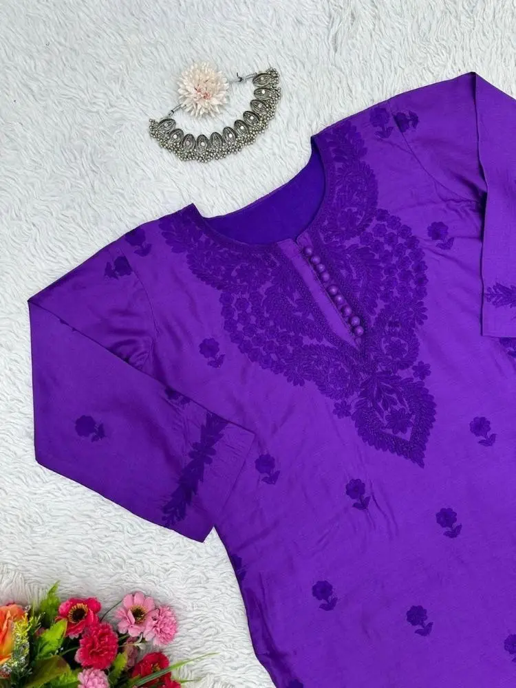 The elegant muslin suit with thread work combines grace and sophistication in a 40-inch length that flatters the figure, crafted from lightweight muslin fabric ideal for any occasion. Intricately designed with delicate thread work by skilled artisans, the suit offers a free size fitting up to size 42, ensuring comfort and style versatility. Paired with stylish heavy rayon pants featuring matching thread work and an elastic waistband, this ensemble exemplifies timeless beauty and craftsmanship, perfect for making a statement at any event or outing.