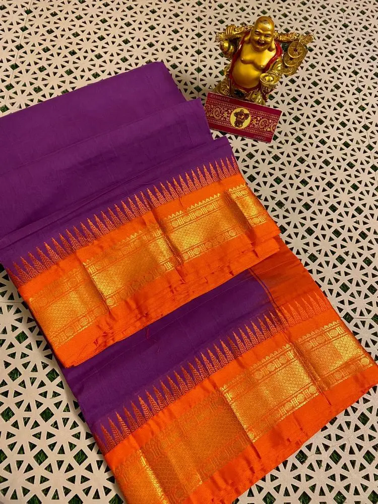 Crafted with semi Gadwal silk fabric, it features intricate zari weaving and elegant borders.
