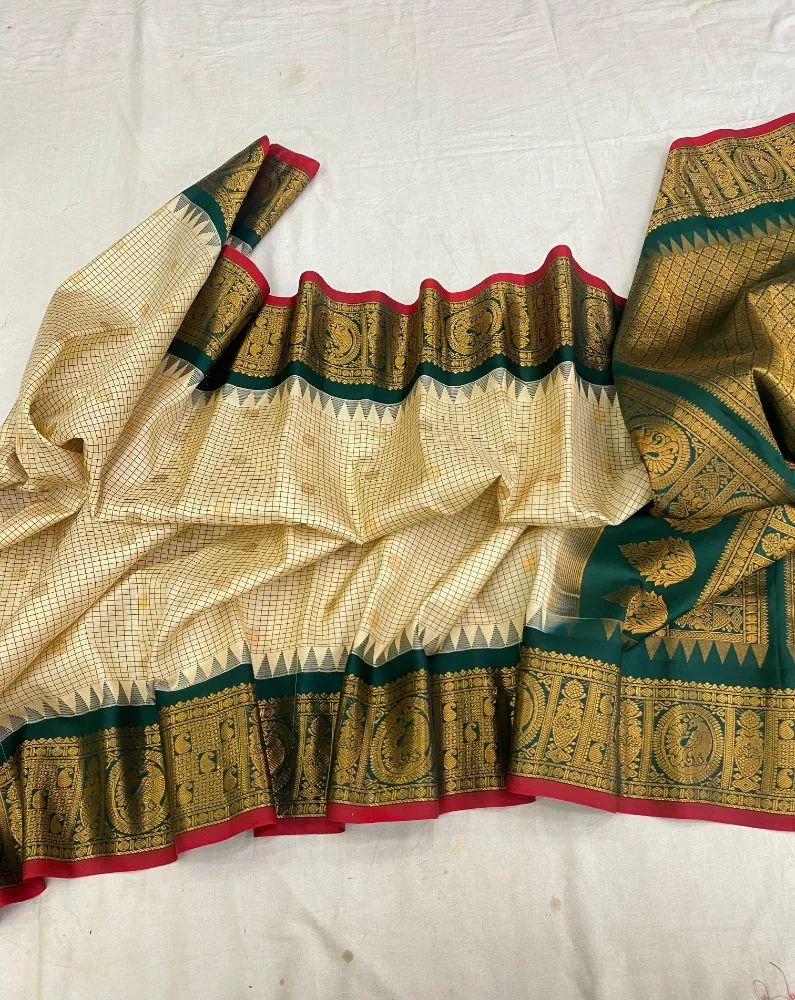 Richly Woven Gadwal Pattu Saree With Temple Border Buttas In Cream Color Code : GOSGDPS100CR