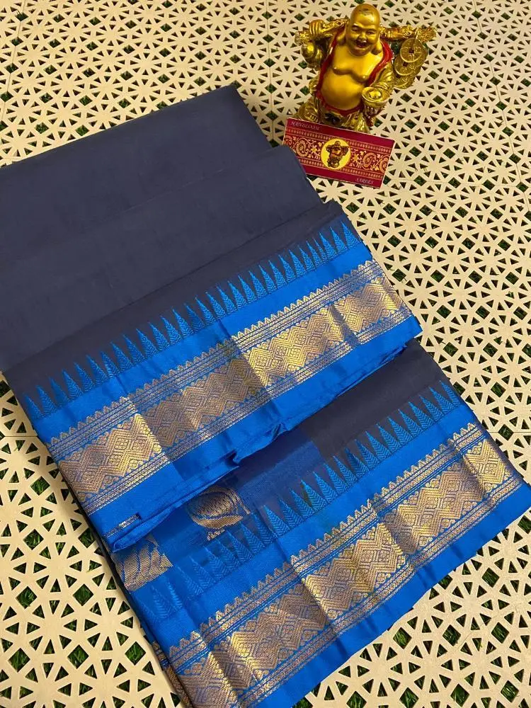 Crafted with semi Gadwal silk fabric, it features intricate zari weaving and elegant borders.