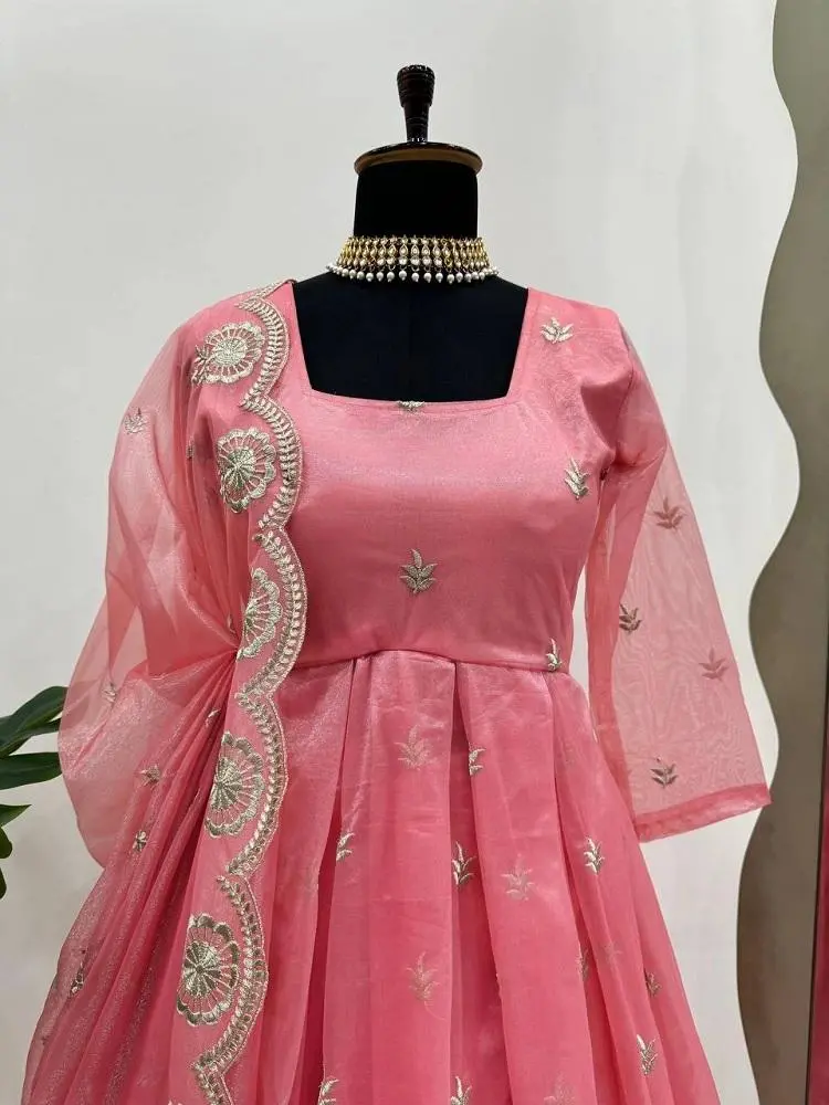 Silk Organza Gown With Cutwork Thread Dupatta In Peach Code : YNGORRRTC5733PE