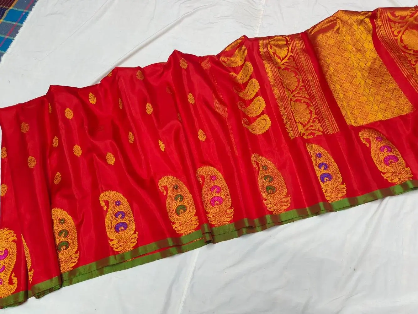 This Gadwal handloom pure silk saree showcases the intricate beauty of the Munia turning border, offering a perfect blend of tradition and elegance.
