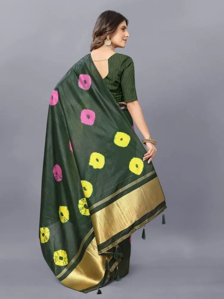 The Shibori Saree features a captivating Bandhani Print, blending two traditional dyeing techniques to create a unique and vibrant design.