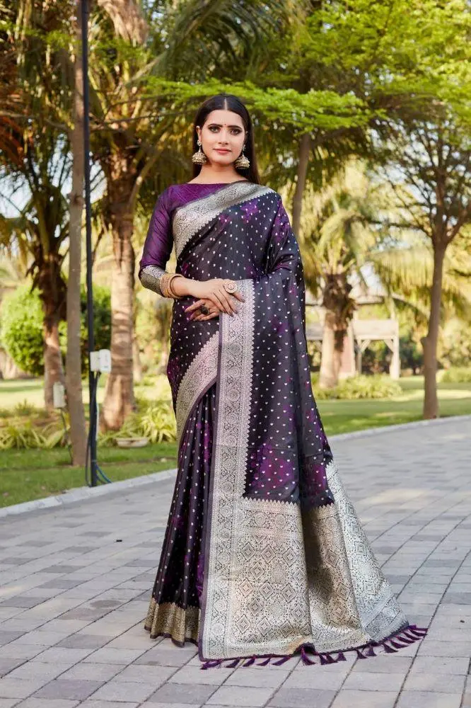 Indulge in the opulence of this Purple Kanjivaram soft satin silk saree. Crafted from superior pure satin silk, this saree offers a luxurious shine and shimmer. The saree is detailed with beautiful weaving butta work throughout the body, complemented by a designer woven border and a rich pallu. Paired with a satin weaving border blouse, this saree is perfect for weddings and grand celebrations, ensuring you make a sophisticated and elegant statement.