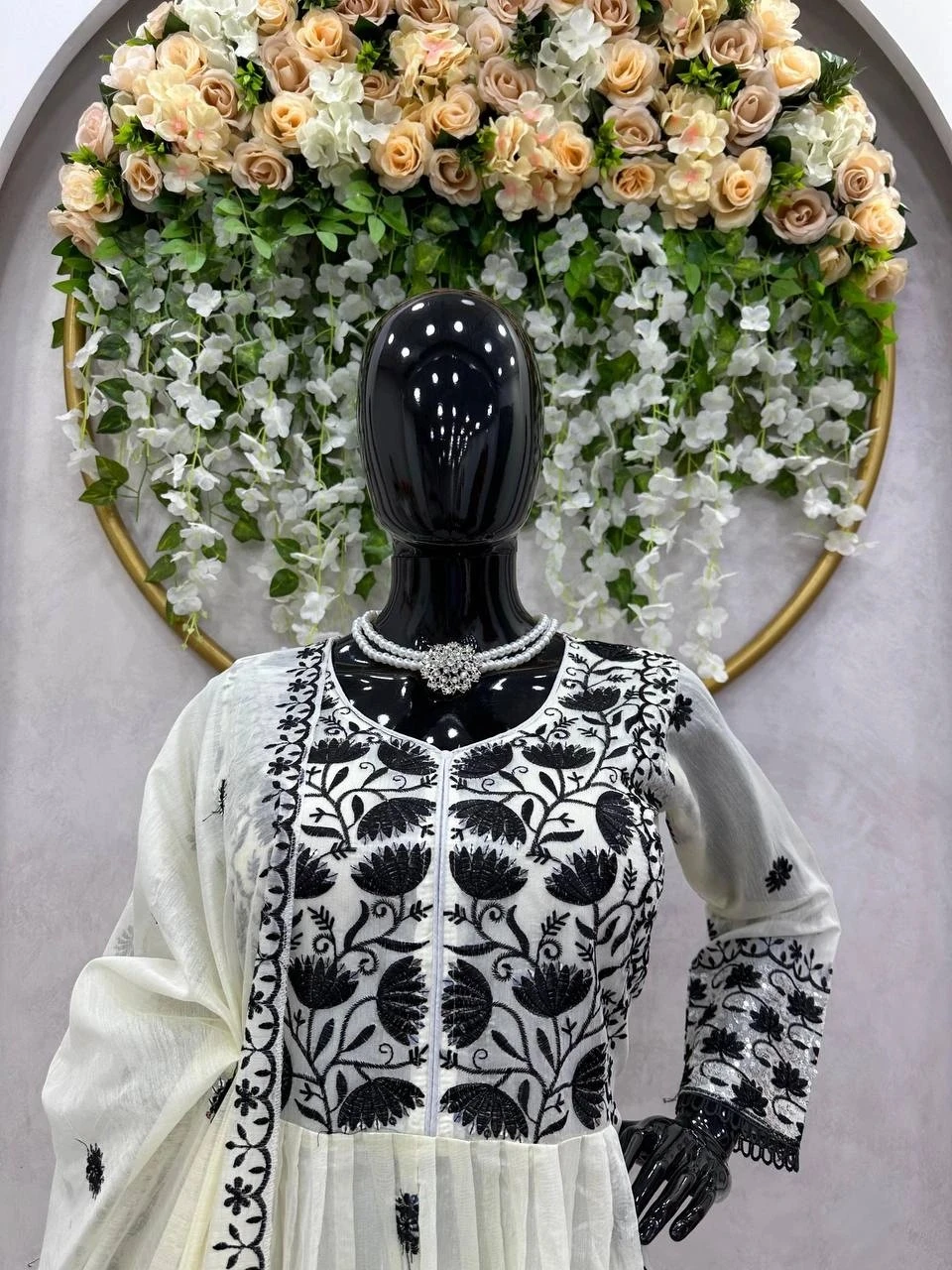 Discover the allure of Chanderi fabric from Madhya Pradesh, India, celebrated for its delicate texture and durability. This ethnic ensemble features intricate thread work and sparkling sequin embellishments, reflecting India's rich heritage and vibrant tapestry of colors. Meticulously crafted, it adds a touch of opulence and glamour, ideal for festive gatherings or weddings with its dazzling effect that catches light beautifully.