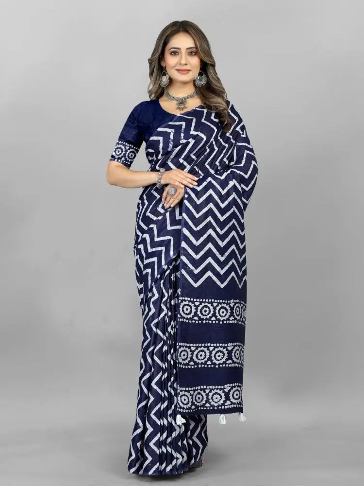 The Shibori Saree features a captivating Bandhani Print, blending two traditional dyeing techniques to create a unique and vibrant design.