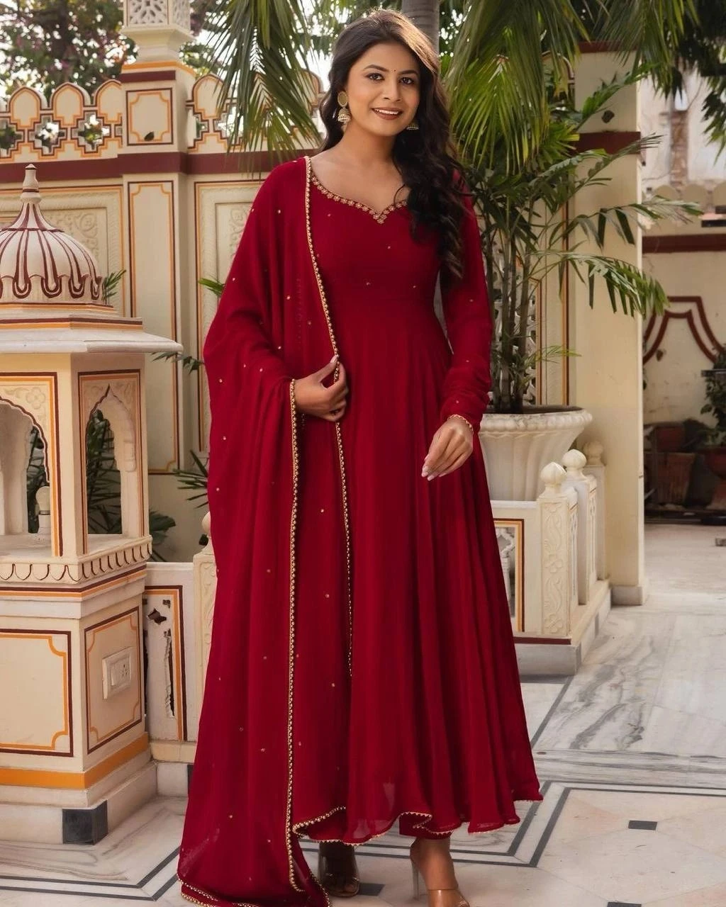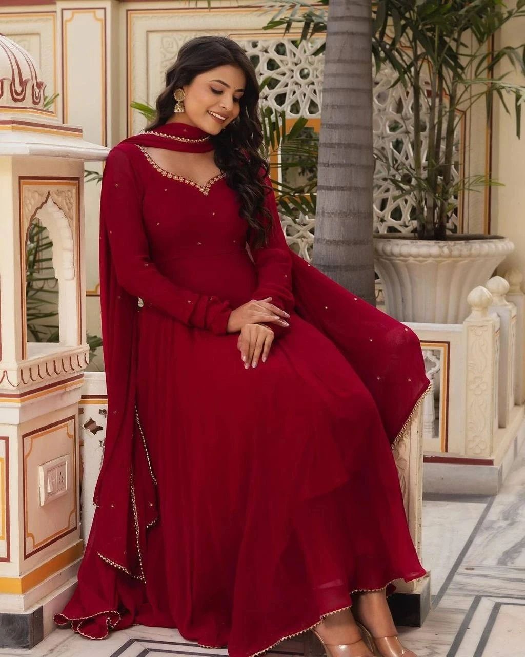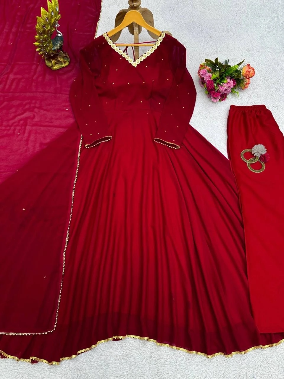 Introducing our exquisite Designer Faux Georgette Suit, crafted with intricate sequin and stone work for a stunning fashion statement. The faux georgette fabric drapes elegantly, enhancing your ensemble with grace and allure. Complemented by comfortable crepe pants and a faux georgette dupatta adorned with moti lace, this suit is perfect for festive occasions, weddings, or special events, offering timeless elegance and style.