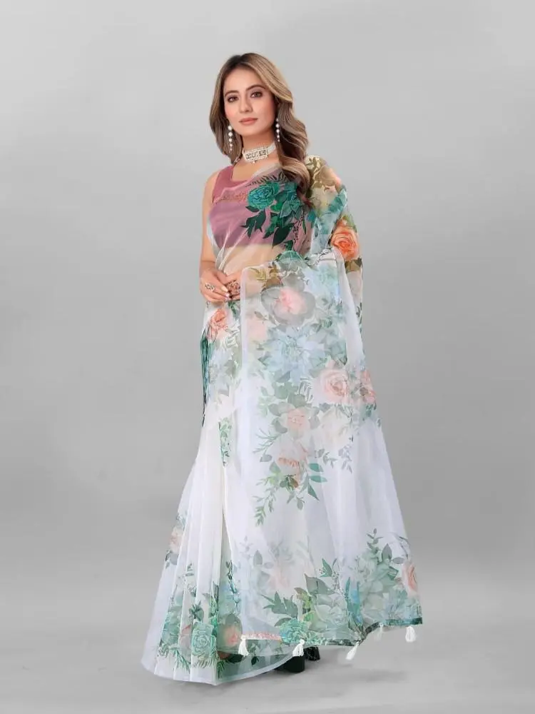 The Organza Silk Saree features a lightweight and airy fabric with a delicate sheen, offering a graceful and elegant drape.