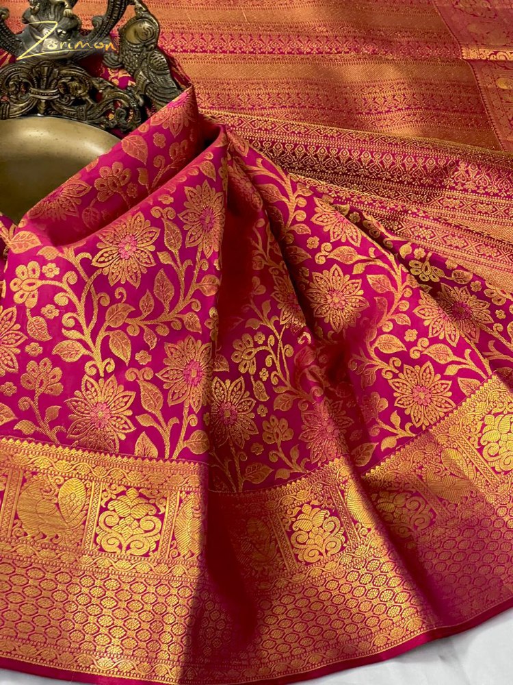 Exude timeless elegance with this pure Kanchipuram silk saree, handloomed to perfection and adorned with 2-gram pure zari. Silk Mark certified, it's an epitome of tradition and grandeur.