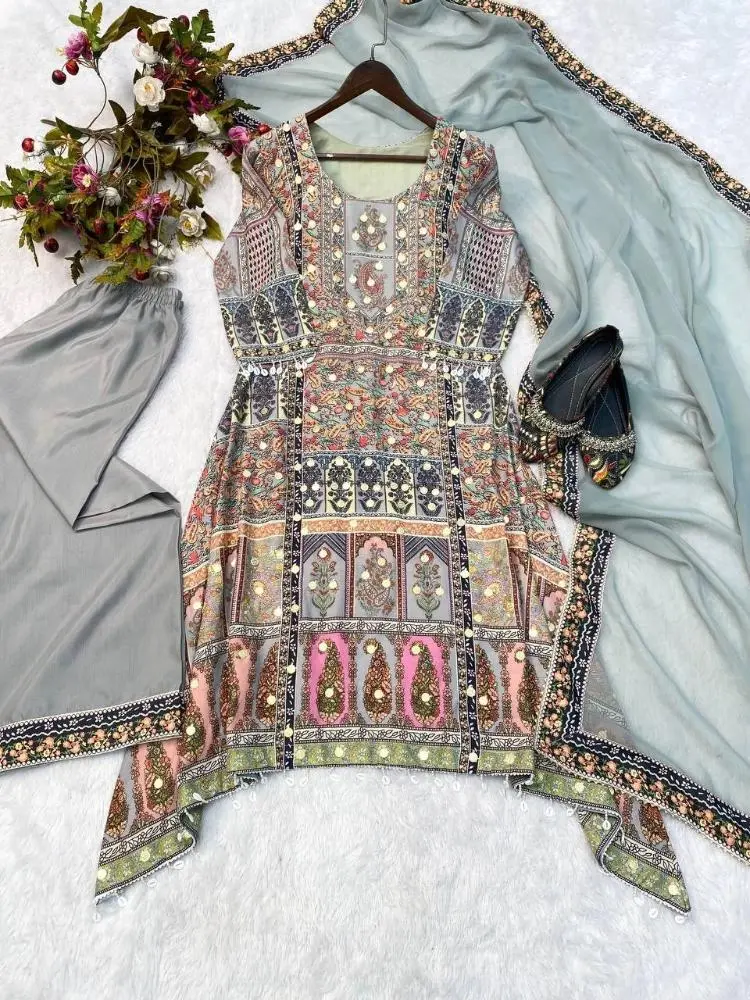 Step into elegance with our Maslin top, featuring intricate printed designs and delicate coin work for a sophisticated look. Paired with comfortable Santoon pants, this set ensures both style and ease of movement. The lightweight Georgette dupatta adds grace and charm, completing the ensemble. Perfect for special occasions or festive celebrations, this outfit blends tradition with contemporary flair, making you the center of attention.