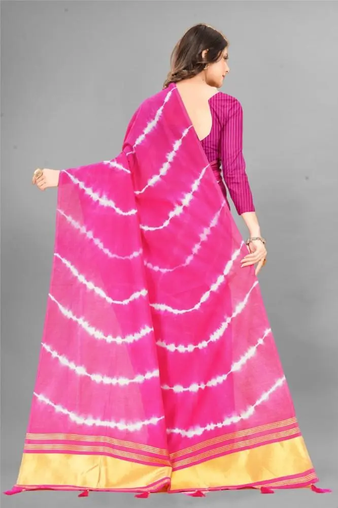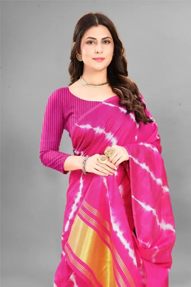 The Shibori Saree features a captivating Bandhani Print, blending two traditional dyeing techniques to create a unique and vibrant design.