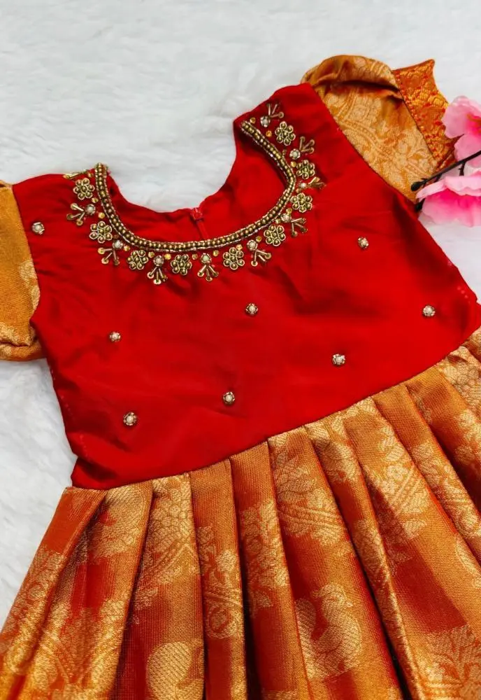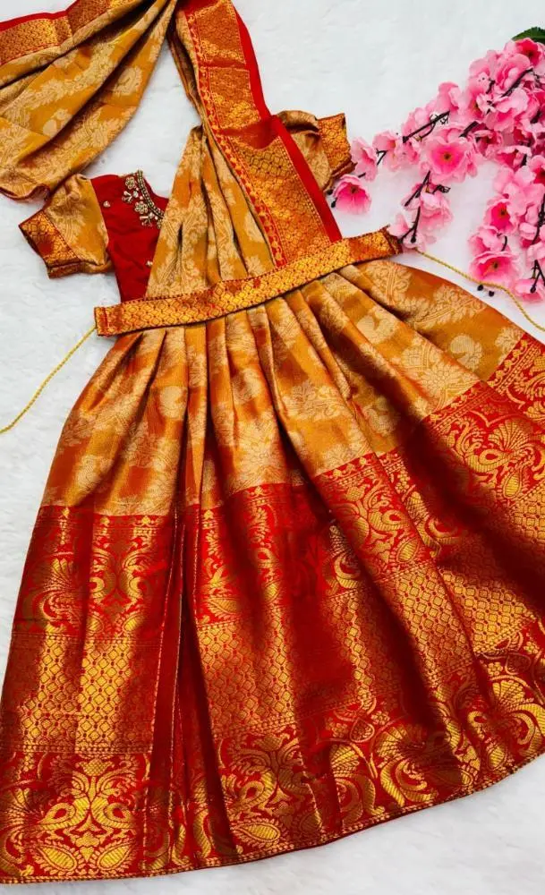 The Kanjivaram Weaving Silk Gown with Zari Weaving Border, Hand-Work Design, and Belted Dupatta is a masterpiece of traditional elegance and modern sophistication. This ensemble beautifully merges the rich heritage of Kanjivaram silk with contemporary design elements, making it perfect for weddings, festivals, and other special occasions.