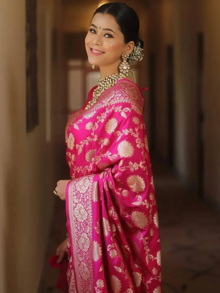 This saree embodies the perfect blend of organic silk's natural beauty and timeless Banarasi artistry.