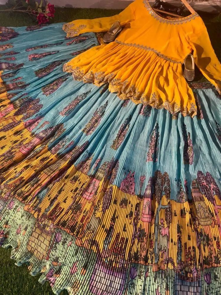 The Tabby Organza Silk Lehenga with Digital Print and Crease Pattern is a perfect blend of modern design and traditional charm.