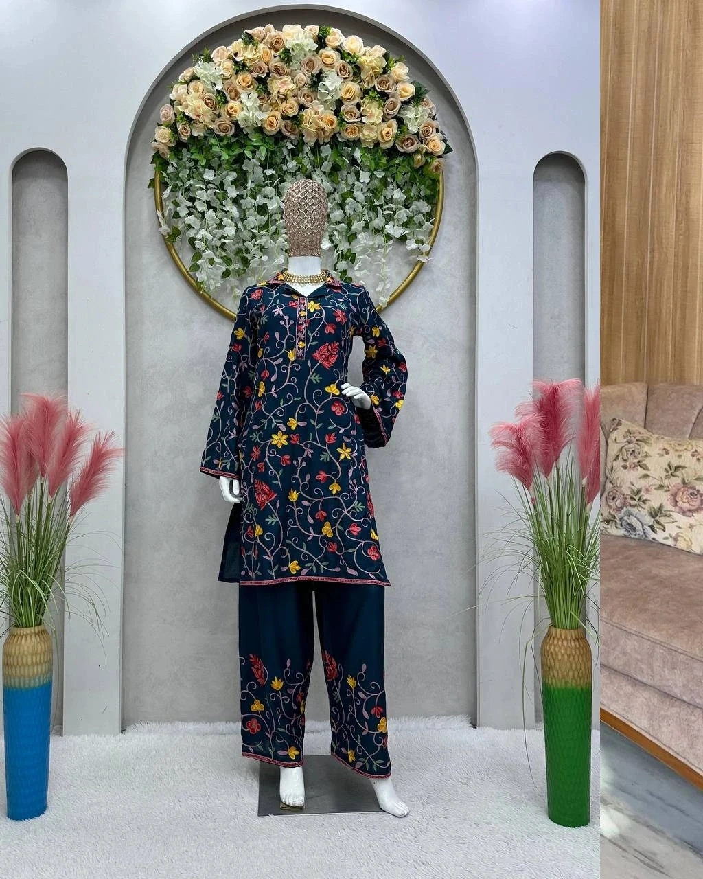 Introducing our Premium Designer Suit crafted from luxurious Reyon fabric, offering unparalleled comfort and sophistication. This ensemble features intricate chain-stitch work and a contemporary silhouette that enhances elegance for any occasion. With a smooth inner lining and impeccable fit, it's perfect for formal events and upscale gatherings, ensuring a lasting impression with its blend of style and craftsmanship.