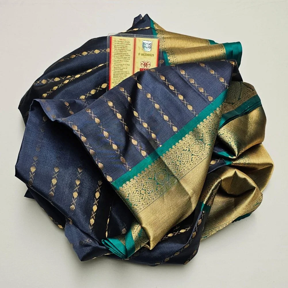 Discover the elegance of this pure handloom double warp Kanchi silk saree, crafted with 100% first-quality silk and adorned with intricate silver and gold zari work.