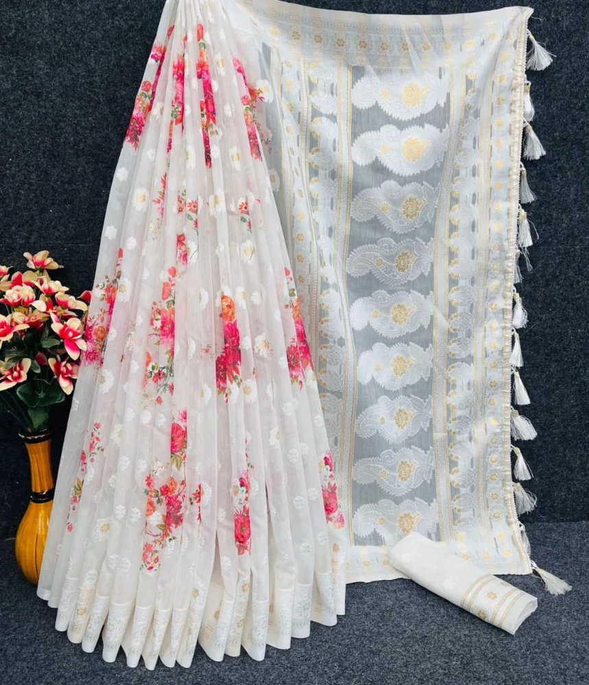 Pure Linen Saree Featuring Digital Print And Jacquard Pallu In White Code : YNSPCF06WH3