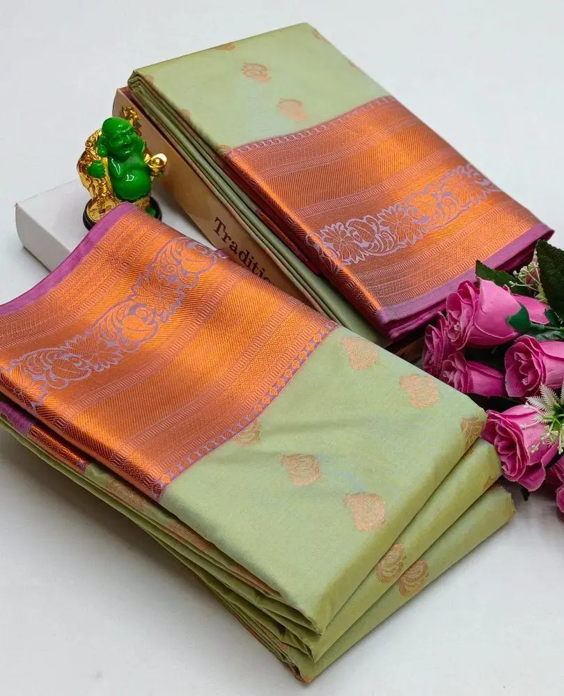 Stylish Semi Kuppadam Soft Silk Saree With Contrast Pallu And Jari Design In Pista Color Code : RTSKUPS1018PS