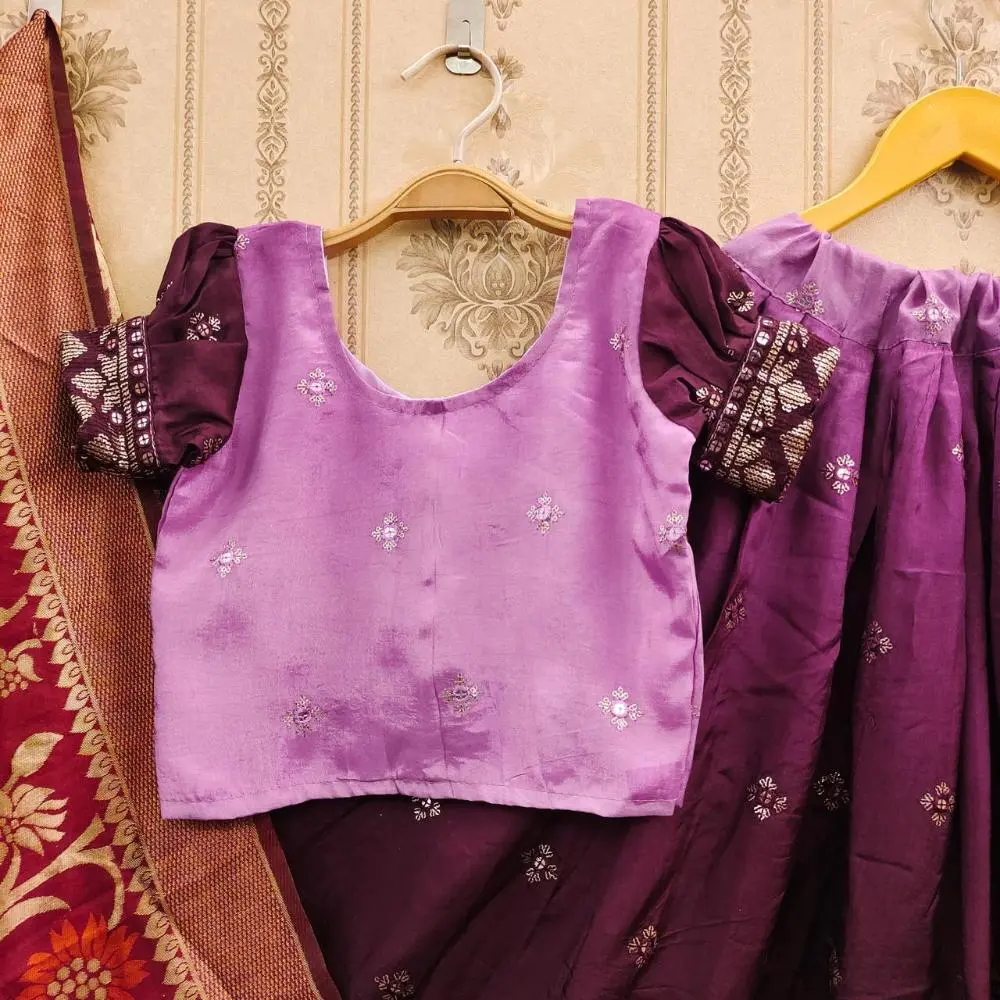 The lehenga, made from soft and flowing viscose georgette silk, offers a luxurious feel and graceful drape.